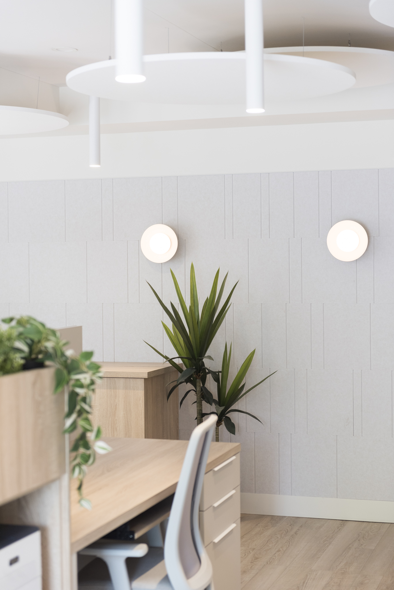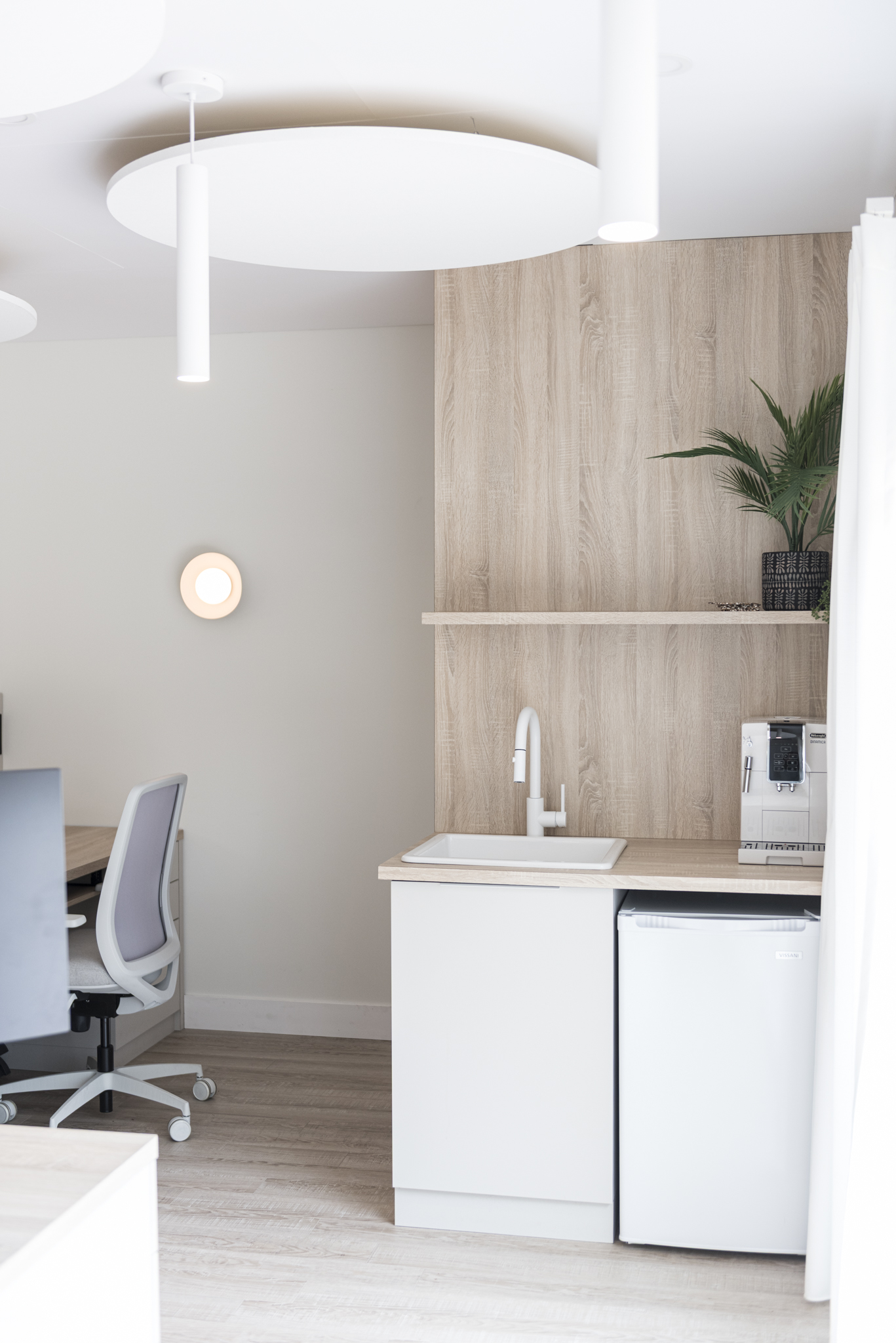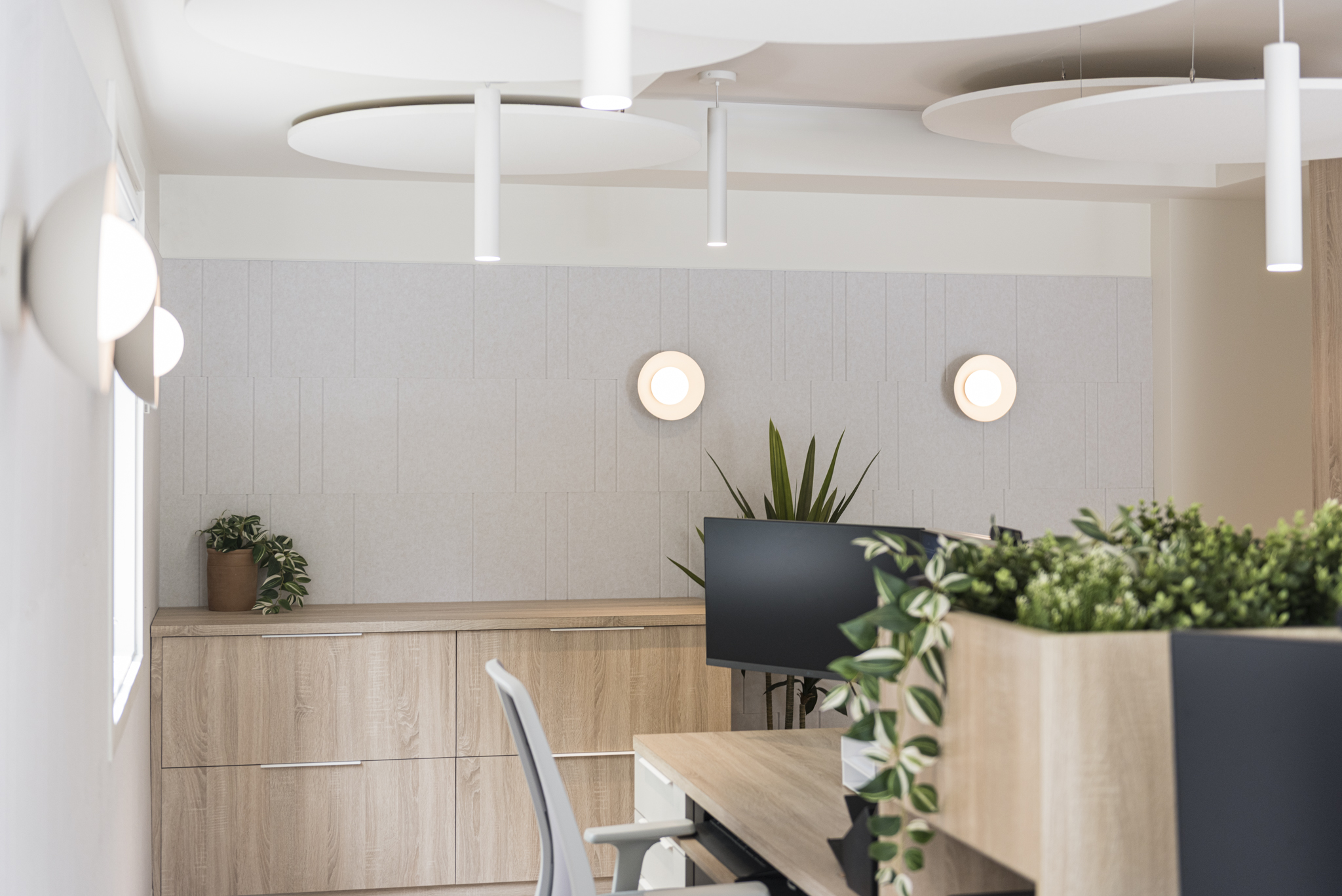 Conception de l’ambiance, recherche des matériaux acoustiques et luminaires, conception du mobilier sur mesure.