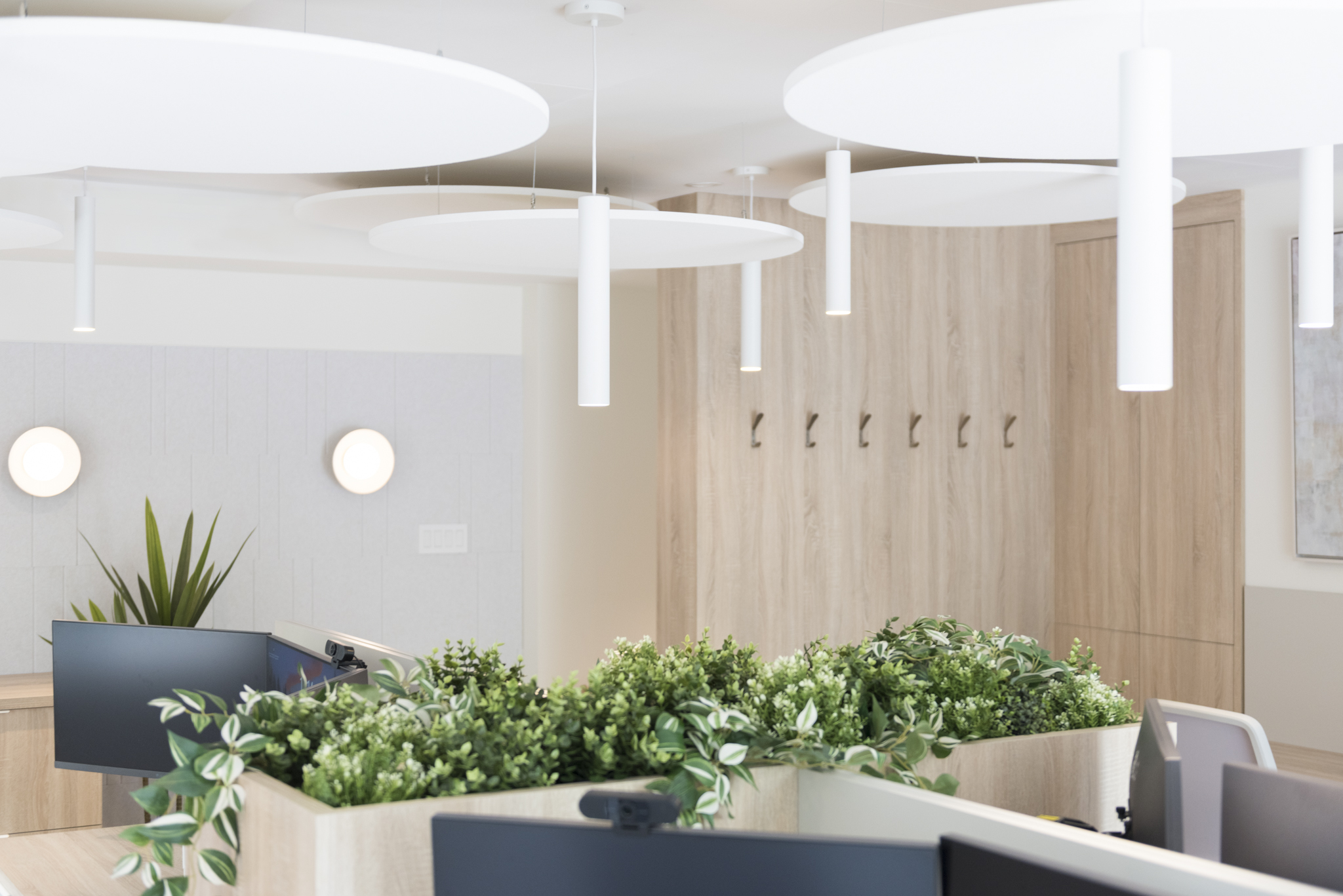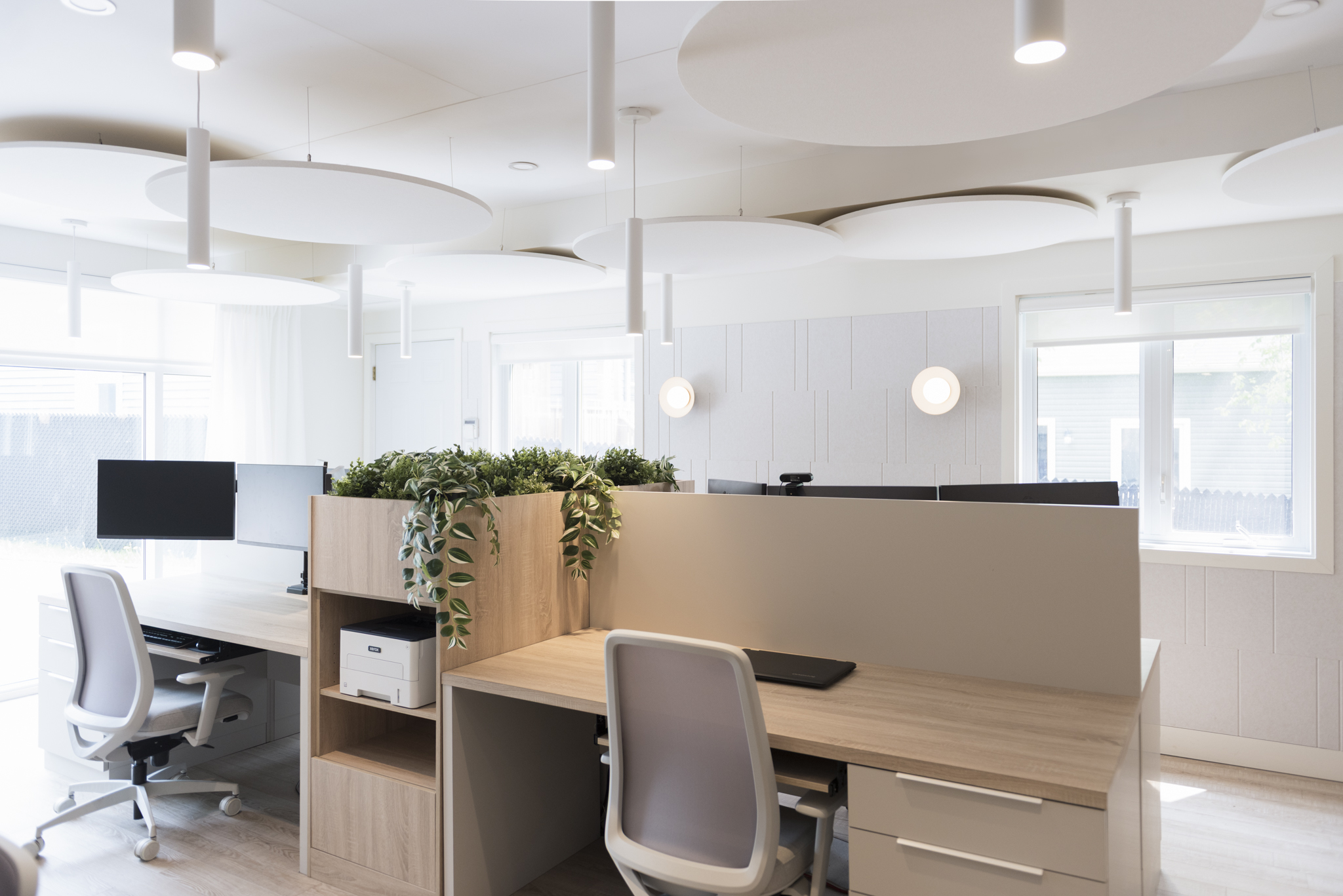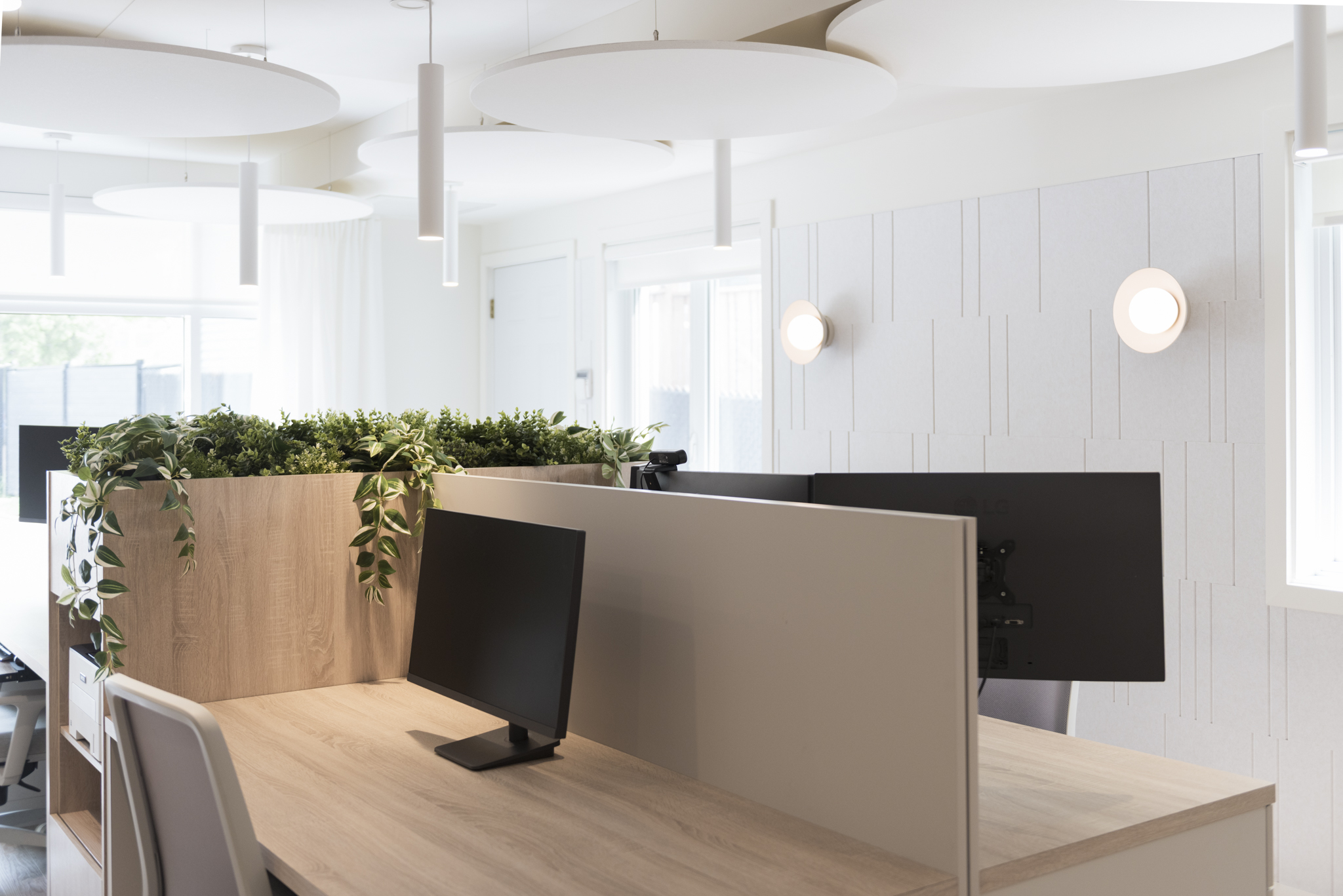Conception de l’ambiance, recherche des matériaux acoustiques et luminaires, conception du mobilier sur mesure.